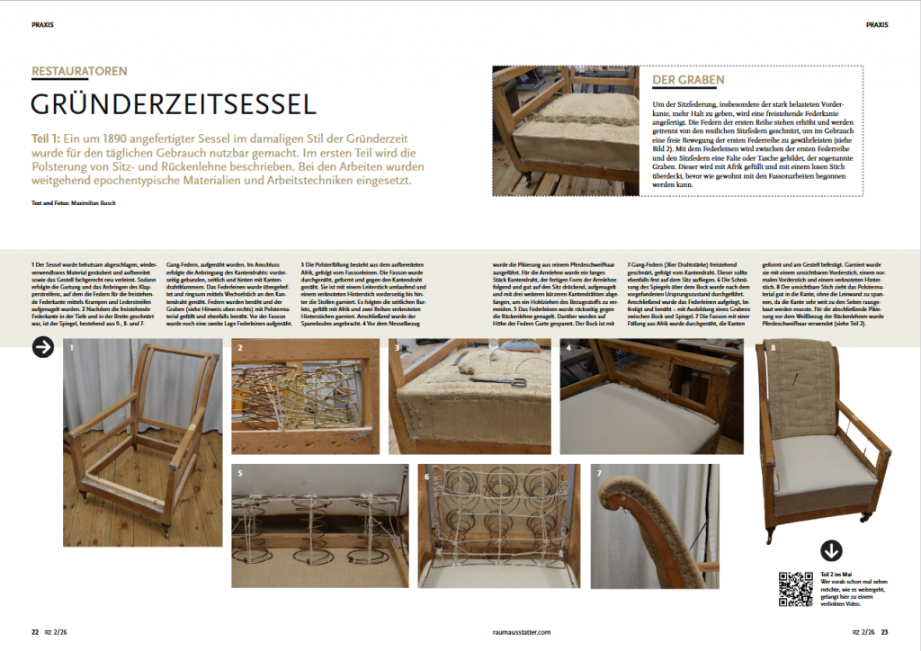 Auch in dieser Ausgabe der RZ ist ein Stück zu sehen, das unsere Werkstatt vor kurzem verlassen hat. Von der Polsterung und dem Bezug des Sessels existiert ein Zeitraffervideo, das alle Arbeitsgänge von Anfang bis Ende dokumentiert. Das Video ist unter dem Bericht zu sehen.