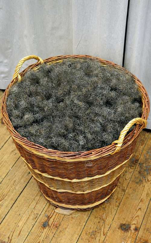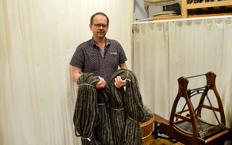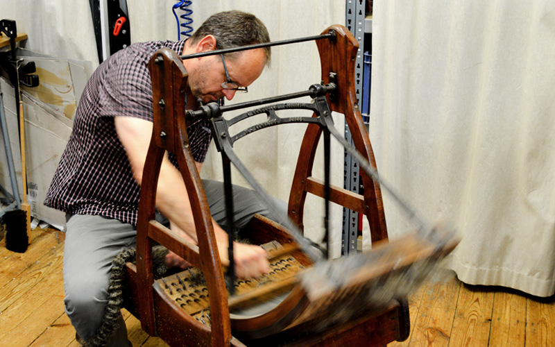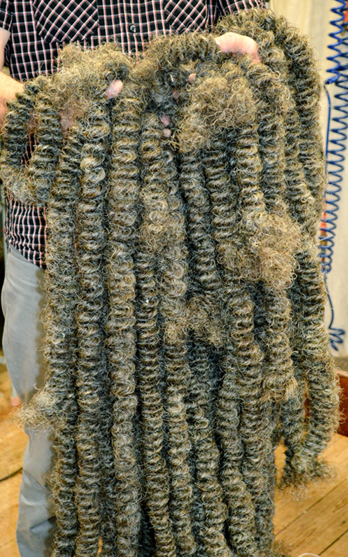 Mit altehrwürdigem Werkzeug werden die aufgedrehten Zöpfe nun aufgekämmt. Dafür werden sie durch die nunmehr über hundert Jahre alte „Cardeuse“, eine originale französische Zupfmaschine, aufgelockert. Hierbei ist höchste Aufmerksamkeit zum Schutz von Haut und Knochen empfehlenswert.